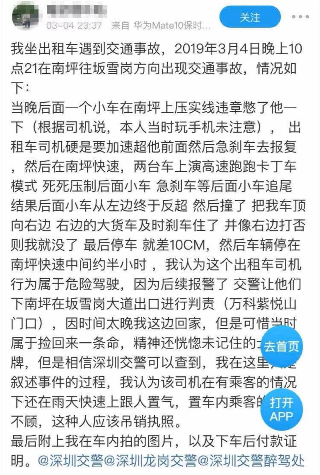 深廣電直播深圳2019年3月11日訊 近日有網(wǎng)友微博舉報(bào),3月4日晚其乘坐的一輛出租車與其他車斗氣引發(fā)交通事故,隨后深圳交警機(jī)動(dòng)訓(xùn)練大隊(duì)對(duì)雙方司機(jī)進(jìn)行調(diào)查。