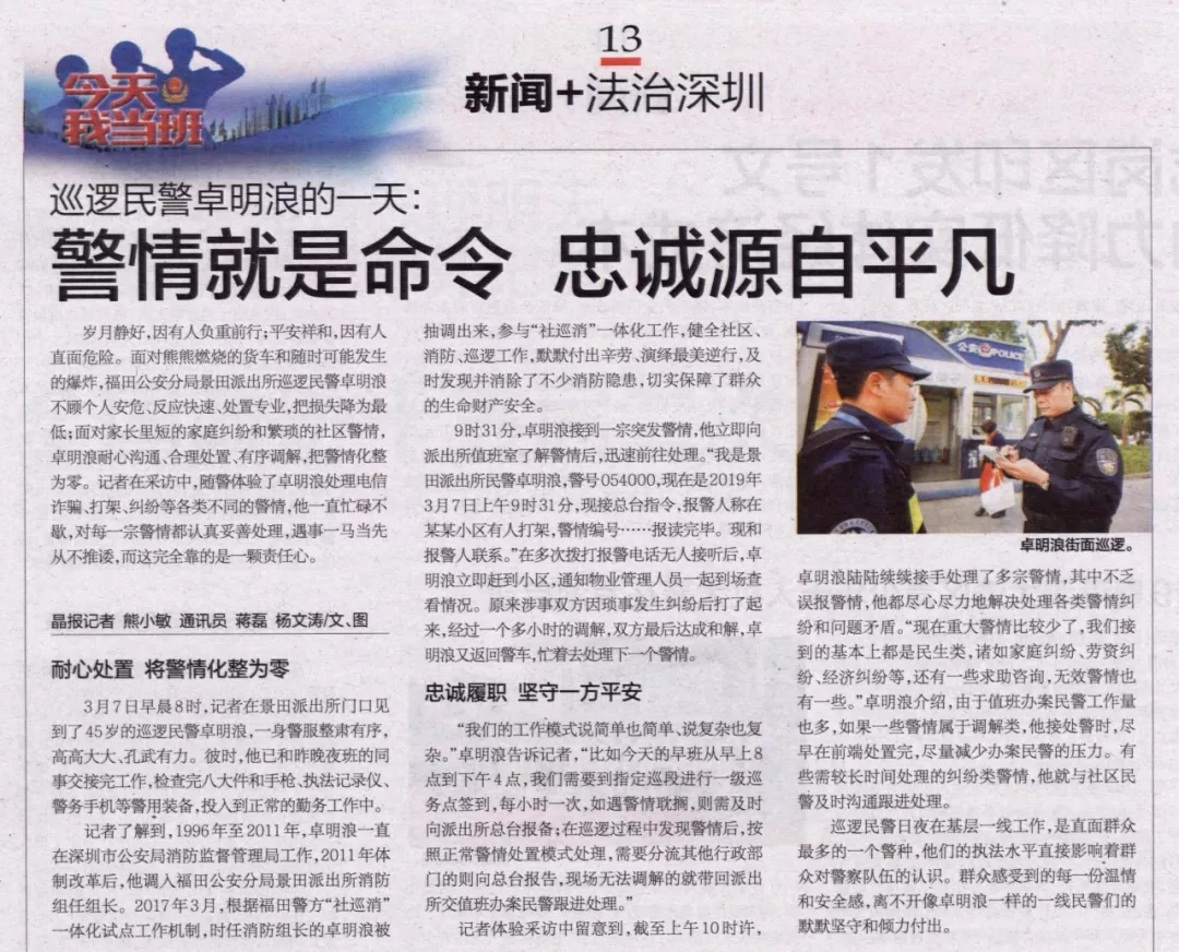 1996年至2011年,卓明浪一直在深圳市公安局消防監(jiān)督管理局工作,2011年體制改革后,他調(diào)入福田公安分局景田派出所消防組任組長。2017年3月,根據(jù)福田警方“社巡消”一體化試點工作機制,時任消防組長的卓明浪被抽調(diào)出來,參與“社巡消”一體化工作,健全社區(qū)、消防、巡邏工作,默默付出辛勞、演繹最美逆行,及時發(fā)現(xiàn)并消除了不少消防隱患,切實保障了群眾的生命財產(chǎn)安全。