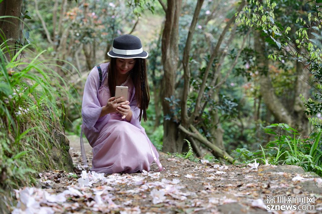 滿地殘花也別有韻味,美女拿著手機在記錄這一刻。