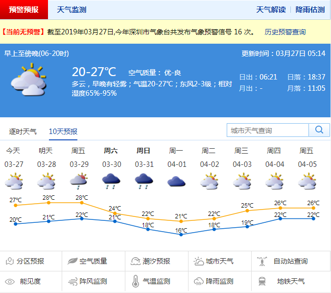 深圳新聞網(wǎng)2019年3月27日訊 深圳今日多云,早晚有輕霧;氣溫20-27℃,相對(duì)濕度65%-95%;東北風(fēng)2-3級(jí)。預(yù)計(jì)28日多云間晴,氣溫繼續(xù)回升,早晚有輕霧或霧;29日多云轉(zhuǎn)雷陣雨;30-31日冷空氣影響,我市陰天有陣雨或雷陣雨,日溫差小,天氣明顯轉(zhuǎn)涼;4月1日陰天轉(zhuǎn)多云,偶有零星小雨。
