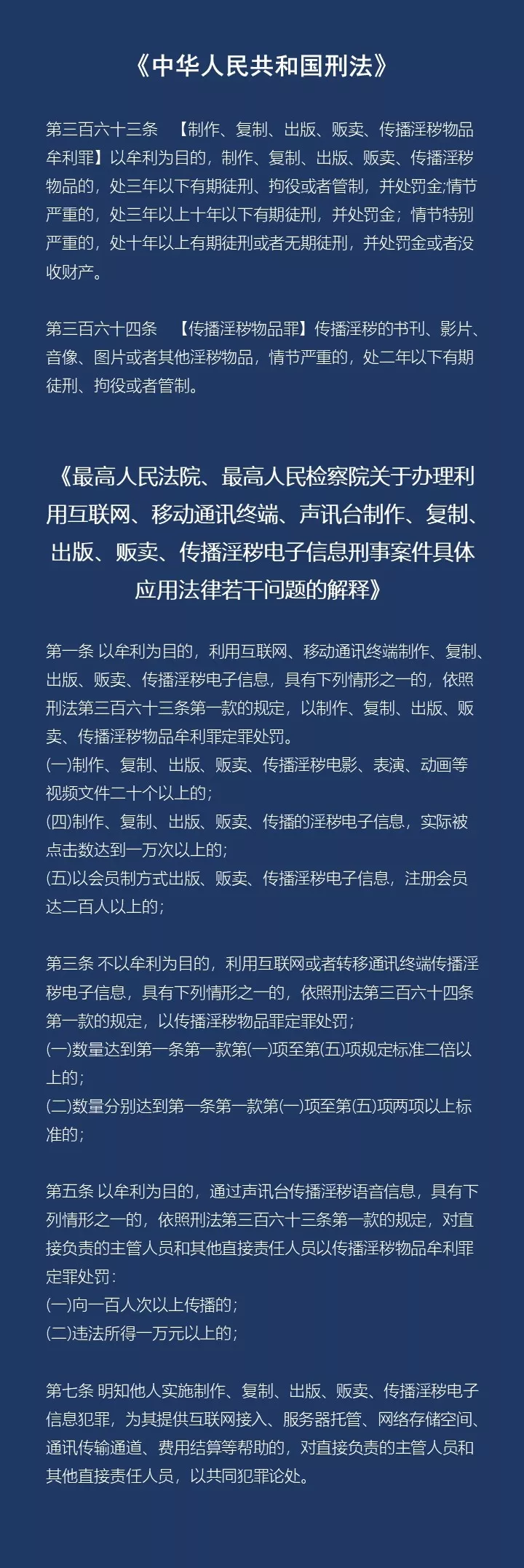 我國《刑法》規(guī)定了對傳播淫穢物品牟利罪、傳播淫穢物品罪的處罰,而最高法、最高檢2004年9月出臺的《關(guān)于辦理利用互聯(lián)網(wǎng)、移動通信終端、聲訊臺制作、復(fù)制、出版、販賣、傳播淫穢電子信息的刑事案件具體應(yīng)用法律若干問題的解釋》,又對此類犯罪認(rèn)定做了詳細(xì)的解釋。