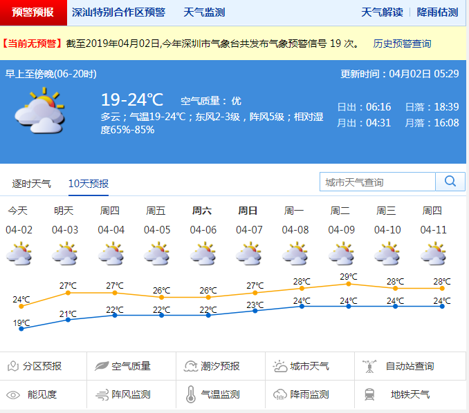 深圳新聞網(wǎng)2019年4月2日訊 近兩天,深圳天氣稍微轉(zhuǎn)涼,偶有分散小雨。預(yù)計今日起可見陽光,氣溫逐日回升。3日多云,可見陽光,間中有陣雨和輕霧,氣溫逐日回升。其中,今日氣溫20 ℃至25 ℃,3日氣溫21 ℃至27 ℃;4日和清明假期多云,可見陽光,間中有陣雨和輕霧。