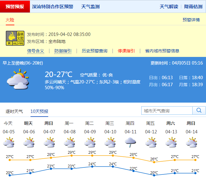 深圳新聞網(wǎng)2019年4月5日訊 深圳市氣象臺(tái)預(yù)計(jì),清明假期(5-7日)我市多云可見(jiàn)陽(yáng)光,溫暖干燥。其中,5日氣溫20℃-27℃,相對(duì)濕度50%-90%,東風(fēng)2-3級(jí);6-7日多云可見(jiàn)陽(yáng)光;8-10日以多云為主,氣溫繼續(xù)上升,偶有分散陣雨。