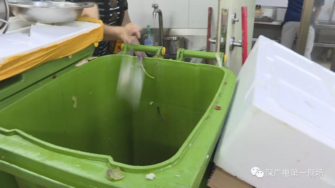 在接下來(lái)的檢查中,執(zhí)法人員發(fā)現(xiàn),后廚操作間的過(guò)道放置了幾個(gè)大垃圾桶,裝滿了餐廚垃圾卻沒(méi)有加蓋。