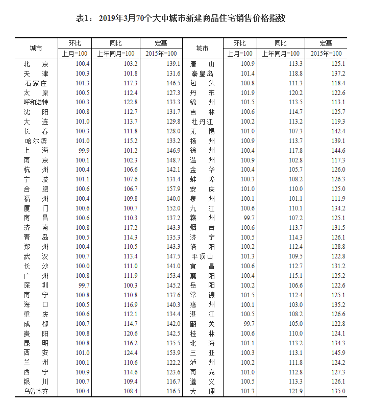 2019年3月份70個(gè)大中城市商品住宅銷(xiāo)售價(jià)格變動(dòng)情況