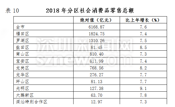 2018年,深圳全市社會(huì)消費(fèi)品零售總額6168.87億元,比上年增長7.6%。按消費(fèi)類型分,商品零售額5424.38億元,增長7.4%;餐飲收入額744.49億元,增長8.4%。
