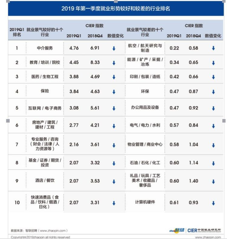 4月20日,智聯(lián)招聘發(fā)布2019年第一季度《中國就業(yè)市場景氣報告》。報告顯示,一季度就業(yè)景氣指數(shù)呈季節(jié)性下降,為1.68。本季度,教育 /培訓(xùn) /院校的招聘需求出現(xiàn)逆市上升,而金融業(yè)招聘職位數(shù)降幅在所有行業(yè)中最大。