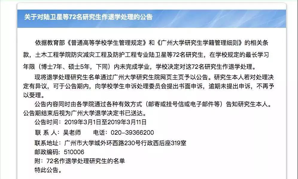 72名研究生在學(xué)校規(guī)定的最長學(xué)習(xí)年限(博士7年、碩士5年,下同)內(nèi)未完成學(xué)業(yè),學(xué)校決定對(duì)這72名研究生作退學(xué)處理。