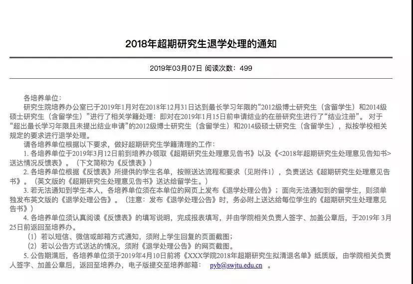 對(duì)于"超出最長學(xué)習(xí)年限且未提出結(jié)業(yè)申請(qǐng)"的2012級(jí)博士研究生(含留學(xué)生)和2014級(jí)碩士研究生(含留學(xué)生),擬按學(xué)校相關(guān)規(guī)定的要求進(jìn)行退學(xué)處理。