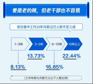 此外,受訪者月薪過萬人數(shù)與隨著工作年限遞增,但工作10年月薪高于1萬的人數(shù)依然不足三成。報告顯示,工作10年以上的受訪者中月薪過萬人數(shù)比例為22.44%、工作5-10年月薪過萬人數(shù)比例為16.85%、工作3-5年月薪過萬人數(shù)比例為13.73%、而工作1-3年月薪過萬人數(shù)比例是8.13%。這也從側(cè)面說明了工作經(jīng)驗(yàn)不是影響工資水平的唯一因素,想要得到高薪,經(jīng)濟(jì)環(huán)境、工作地域、從事行業(yè)等因素也至關(guān)重要。