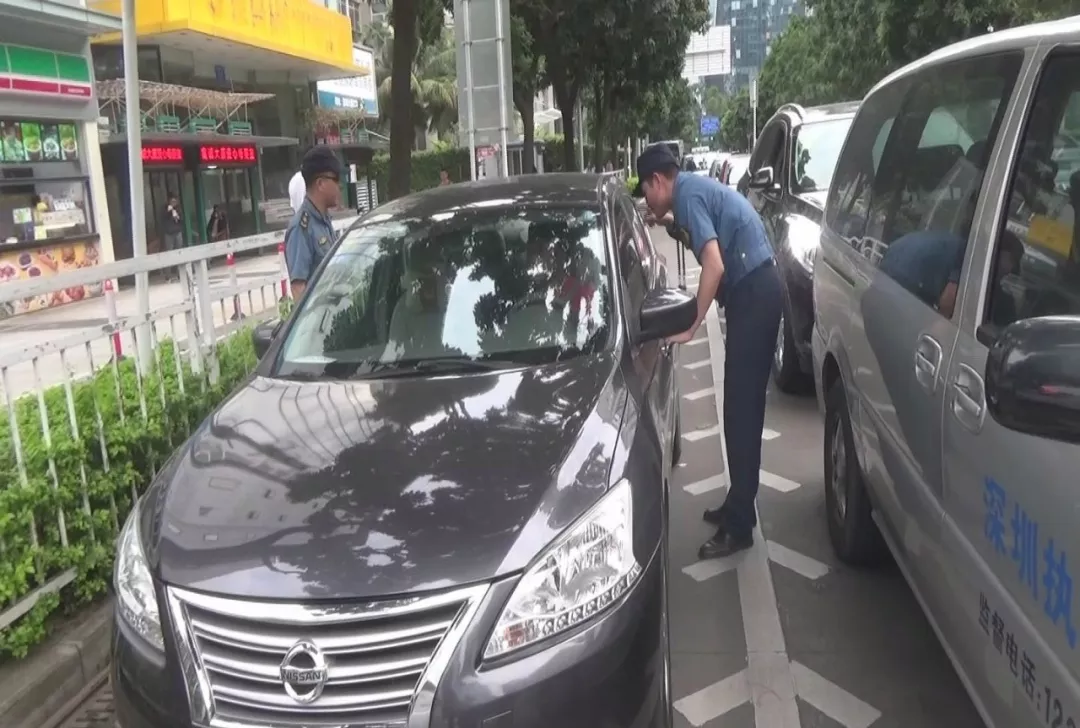 執(zhí)法人員例行對車牌號為粵BT***的小轎車進(jìn)行檢查,司機(jī)將車窗降下,緩緩駛?cè)氪龣z區(qū)域。