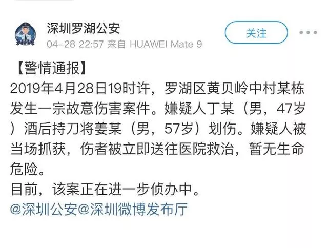 據(jù)記者了解,嫌疑人被當(dāng)場(chǎng)抓獲,傷者被立即送往醫(yī)院救治暫無(wú)生命危險(xiǎn)。羅湖公安也發(fā)布了警情通報(bào),行兇者是酒后持刀傷人,警方通報(bào)如下: