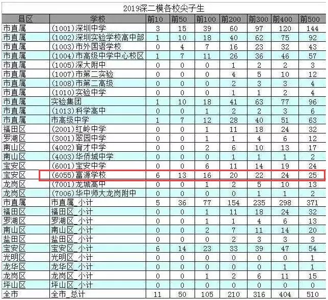 總分前十名中,深圳富源學(xué)校占了六人。前五十名,富源學(xué)校占了十三人,總分前一百名占了十六人。可是總分前五百名中,富源學(xué)校占到的數(shù)量卻沒有超過30人。