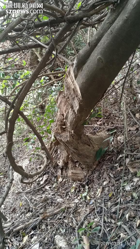 該網(wǎng)友提及的應(yīng)人石村位于深圳石巖,從地圖上看,其“后山”與羊臺山森林公園連為一體,是附近居民閑暇時度假踏青的重要選擇。據(jù)了解,網(wǎng)友“詩奴L”于今年3月中旬上山游玩,游玩途中發(fā)現(xiàn)原本茂盛的野生沉香樹大多遭人砍伐?!安环ǚ肿痈F盡一切手段,用鉆、削、劈、鋸等來對沉香樹進行摧殘,這簡直是屠殺式的洗劫!”該網(wǎng)友表示,看到這么多野生沉香樹被殘暴砍伐,真地讓人很氣憤。
