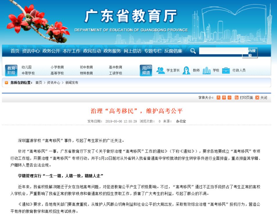 目前,深圳市已成立專項(xiàng)工作小組進(jìn)行調(diào)查。廣東省教育廳廳長(zhǎng)景李虎昨天表態(tài),將在10號(hào)前對(duì)外省轉(zhuǎn)入生轉(zhuǎn)學(xué)條件進(jìn)行排查,并公布舉報(bào)郵箱,對(duì)“事情進(jìn)行徹底的整理”,明確:“一旦發(fā)現(xiàn)高考移民將安排回原籍高考,高考后發(fā)現(xiàn)高考移民將取消高考成績(jī)”。