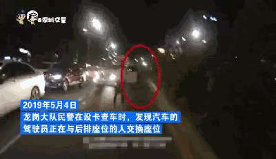 2019年5月4日1時(shí)41分許,深圳交警在龍崗區(qū)寶龍街道設(shè)卡查車時(shí),發(fā)現(xiàn)粵B號(hào)牌小型汽車的駕駛員正在與后排座位的人交換座位。
