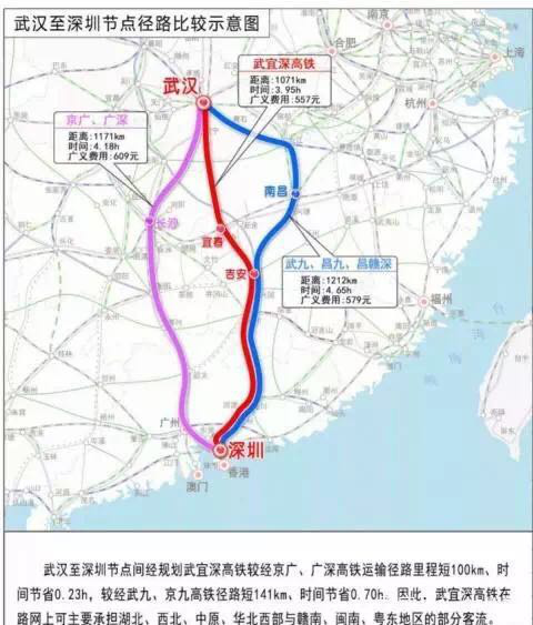 據(jù)了解,為了分流日益飽和的京廣高鐵客流,湖北提出擬在武漢和深圳之間建設(shè)一條高鐵。武深高鐵大致走向?yàn)椋何錆h -咸寧 -修水 -銅鼓 -宜豐 -萬(wàn)載 -宜春 -安福 -井岡山 -遂川 -贛州 -深圳。一旦建成,將形成武漢到深圳的一條筆直線路。初步預(yù)測(cè)分析,新規(guī)劃的武漢至深圳高速鐵路,較經(jīng)京廣、廣深高鐵運(yùn)輸徑路里程短100多公里,時(shí)間節(jié)省20分鐘;較經(jīng)武九、京九高鐵徑路短141公里,時(shí)間節(jié)省42分鐘。