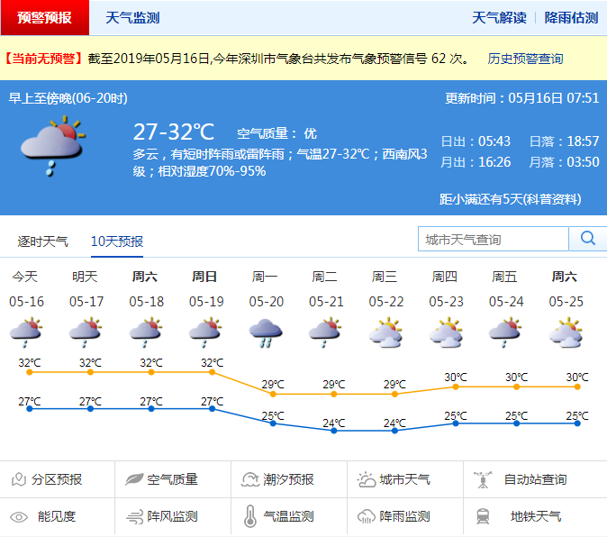 深圳新聞網2019年5月16日訊 本周深圳天氣持續(xù)炎熱,市民中心站最高氣溫甚至超過35℃。記者從市氣象局了解到,16日至19日天氣炎熱,最高氣溫達32℃,以多云為主,多局地性(雷)陣雨;19日夜間至20日有一次明顯降雨并伴有雷雨大風。