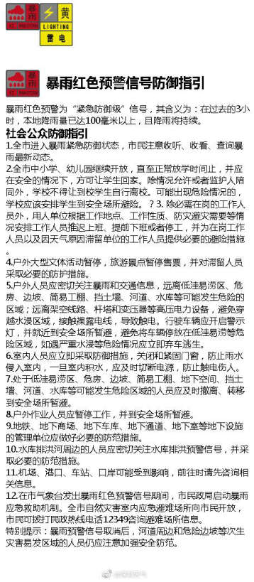 【上班天氣】暴雨:預(yù)計早晨6-9時,全市陰天有暴雨,局部大暴雨伴有雷暴和6-7級短時大風(fēng),暴雨紅色分區(qū)預(yù)警信號生效中,請市民遠(yuǎn)離低洼易澇區(qū)、危房、邊坡、簡易工棚、擋土墻、河道、水庫等可能發(fā)生危險的區(qū)域,注意交通安全。