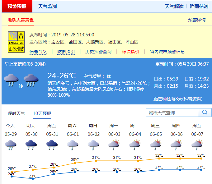 據(jù)氣象預(yù)報,29日白天有中到大雨,局部暴雨;30日有雷陣雨,局部大雨。;31日-6月1日有陣雨,部分時間雨勢稍大。需重點防御持續(xù)強降水引發(fā)的地質(zhì)災(zāi)害、城市積澇等次生災(zāi)害。