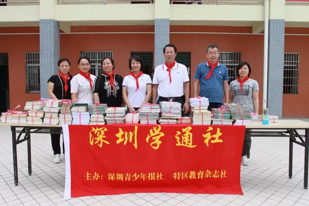 在捐贈儀式上,同學(xué)們?yōu)檫h(yuǎn)道而來的叔叔阿姨系上了紅領(lǐng)巾,這些“大紅領(lǐng)巾”陪著“小紅領(lǐng)巾”,提前歡慶六一兒童節(jié)的到來??偵邕€為雅色的孩子帶來一份大禮,那就是深圳學(xué)通社學(xué)生記者站在頌平小學(xué)掛牌。