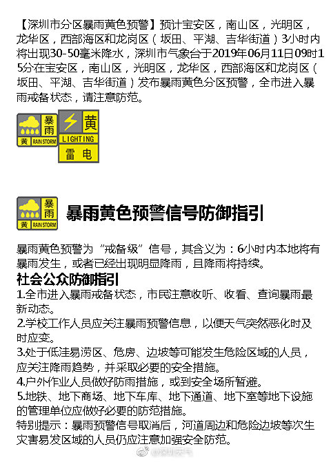 【深圳市分區(qū)暴雨黃色預警】預計寶安區(qū),南山區(qū),光明區(qū),龍華區(qū),西部海區(qū)和龍崗區(qū)(坂田、平湖、吉華街道)3小時內(nèi)將出現(xiàn)30-50毫米降水,深圳市氣象臺于2019年06月11日09時15分在寶安區(qū),南山區(qū),光明區(qū),龍華區(qū),西部海區(qū)和龍崗區(qū)(坂田、平湖、吉華街道)發(fā)布暴雨黃色分
