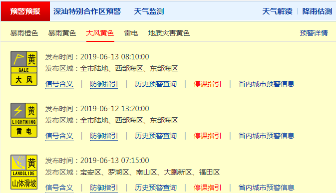 【深圳市地質(zhì)災(zāi)害氣象風(fēng)險(xiǎn)預(yù)警2019年第17號】根據(jù)目前降雨情況,結(jié)合我市地質(zhì)環(huán)境條件,現(xiàn)對全市陸地發(fā)布地質(zhì)災(zāi)害氣象風(fēng)險(xiǎn)黃色預(yù)警,氣象因素致上述地區(qū)發(fā)生地質(zhì)災(zāi)害的風(fēng)險(xiǎn)較高,請相關(guān)部門和單位做好地質(zhì)災(zāi)害各項(xiàng)防御工作。