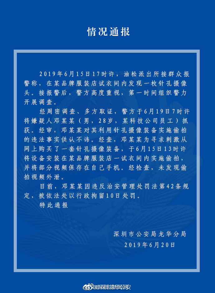 6月19日,深圳市一家優(yōu)衣庫(kù)門店暗藏針孔攝像頭一事有了最新進(jìn)展。龍華警方表示,嫌疑人鄧某某(男,28歲)已被抓獲,其為某科技公司員工,為求刺激安裝,目前被依法處以行拘10日處罰,未發(fā)現(xiàn)視頻外泄。多地多起偷拍事件頻發(fā),證明這不是孤立的個(gè)案。想管住日漸泛濫的針孔攝像頭,不能僅靠公眾每次住宿時(shí)的“偵探式”自救和“地毯式”搜查,諸多應(yīng)對(duì)的方法也難逃人性與欲望的丑惡。涉事的優(yōu)衣庫(kù)門店在事發(fā)時(shí)曾表示,檢查試衣間只檢查是否有顧客遺留物品,而此前某涉事酒店負(fù)責(zé)人以攝像頭安裝隱蔽、工作人員難以發(fā)現(xiàn)、不專業(yè)為由,回避問題。店家事后的說辭讓人心生涼意,大事化小、小事化了的補(bǔ)救措施也不能消除消費(fèi)者心中的恐懼,作為管理方尚且如此態(tài)度,作為弱勢(shì)群體的消費(fèi)者,還需要多少案例才能換來隱私的保障?