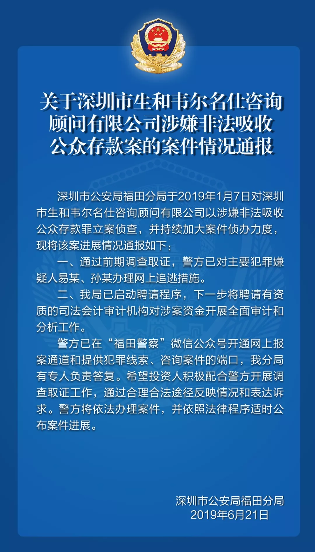 關(guān)于深圳市生和韋爾名仕咨詢(xún)顧問(wèn)有限公司涉嫌非法吸收公眾存款案的案件情況通報(bào)
