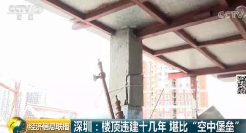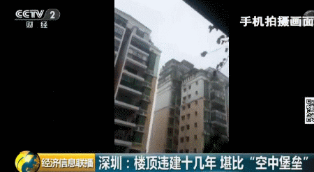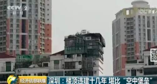 深圳福田區(qū)一個小區(qū)的居民日前爆料稱,小區(qū)一位業(yè)主違規(guī)在天臺上加建了幾層樓,遠(yuǎn)遠(yuǎn)看去就像一個“空中堡壘”,曾經(jīng)有人差點被上面掉落的鋼筋砸中,如此醒目的違建,已經(jīng)存在了十幾年。