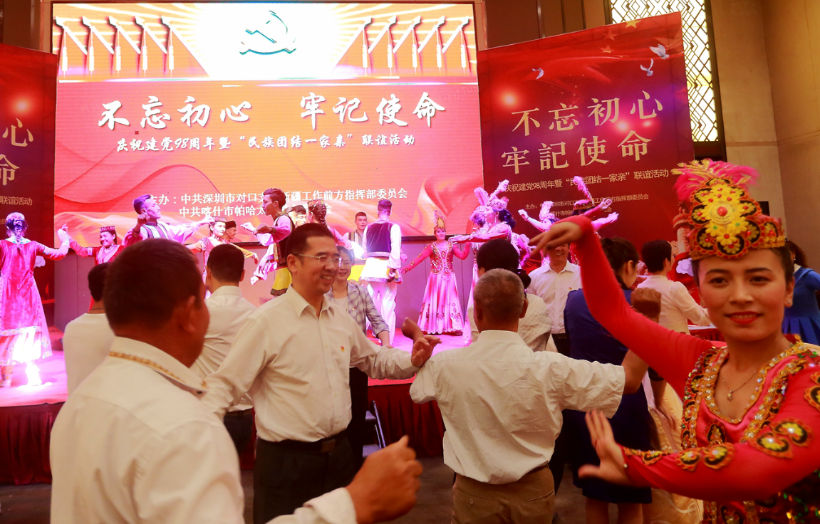 深圳新聞網2019年7月1日訊 盛夏七月,紅色黨旗迎風飄,為積極響應黨中央關于在全黨開展“不忘初心牢記使命”主題教育的重大部署。6月30日,深圳援疆前方指揮部、中共喀什市帕哈太克里鄉(xiāng)委員會聯合組織開展慶祝建黨98周年暨“民族團結一家親聯誼”活動??κ驳貐^(qū)行署領導、全體援疆干部人才、帕哈太克里鄉(xiāng)結親群眾等300余人參與活動。