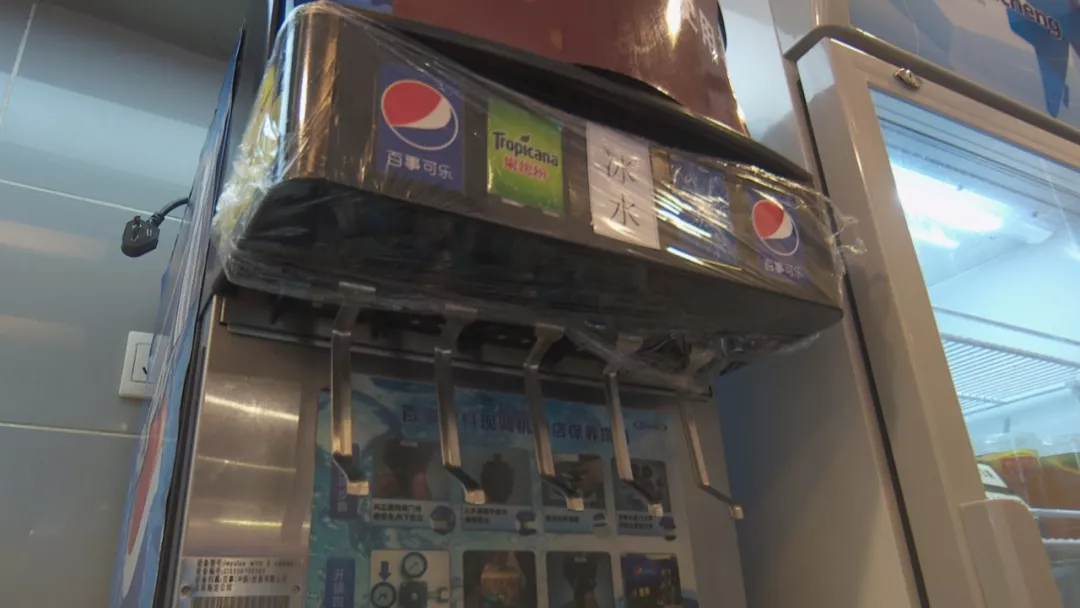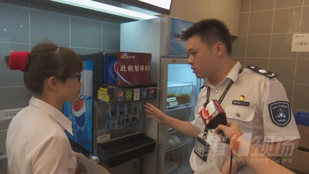 今天中午,記者跟隨轄區(qū)市監(jiān)所執(zhí)法人員來(lái)到涉事門店現(xiàn)場(chǎng)檢查。據(jù)了解,2號(hào)事發(fā)后,店里的這臺(tái)飲料機(jī)已經(jīng)暫停使用,目前飲料出口是用保鮮膜封住的。店方稱,飲料機(jī),每個(gè)月由百事可樂(lè)廠家人員深層清洗一次,他們的員工是每天對(duì)飲料機(jī)的糖漿管道和濾嘴進(jìn)行清洗,都有清洗記錄。