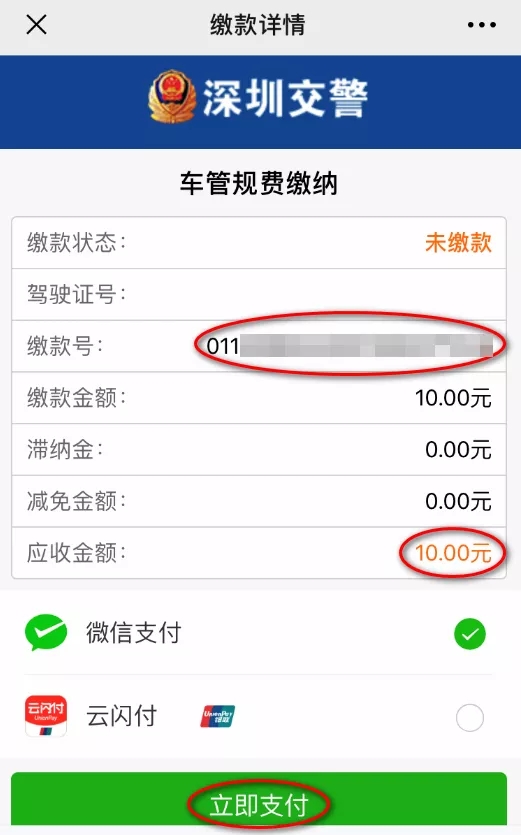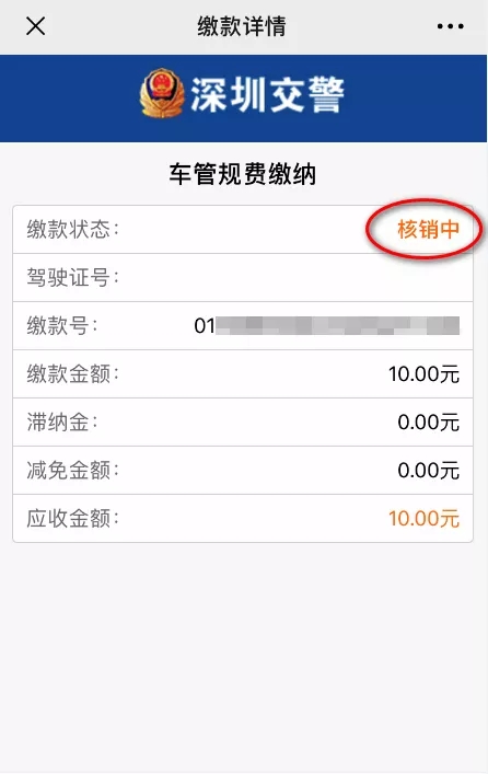 03 提交繳費(fèi)后,核對(duì)繳款號(hào)(前面會(huì)多01),應(yīng)收金額為10元。繳費(fèi)后再次查詢(xún)?cè)摿魉?,狀態(tài)為“核銷(xiāo)中”(即繳費(fèi)成功)。