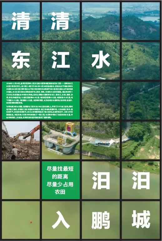 第三部分“清清東江水汩汩入鵬城”,著重展示東江水源工程建設(shè)的全過(guò)程。以工程線(xiàn)路為展覽線(xiàn)索,再現(xiàn)水務(wù)工作者在長(zhǎng)達(dá)106公里的戰(zhàn)線(xiàn)上奮戰(zhàn)的場(chǎng)面。通過(guò)輸水設(shè)施的新舊照片對(duì)比,描繪出一條在深惠兩城平地崛起的深圳“生命線(xiàn)”。