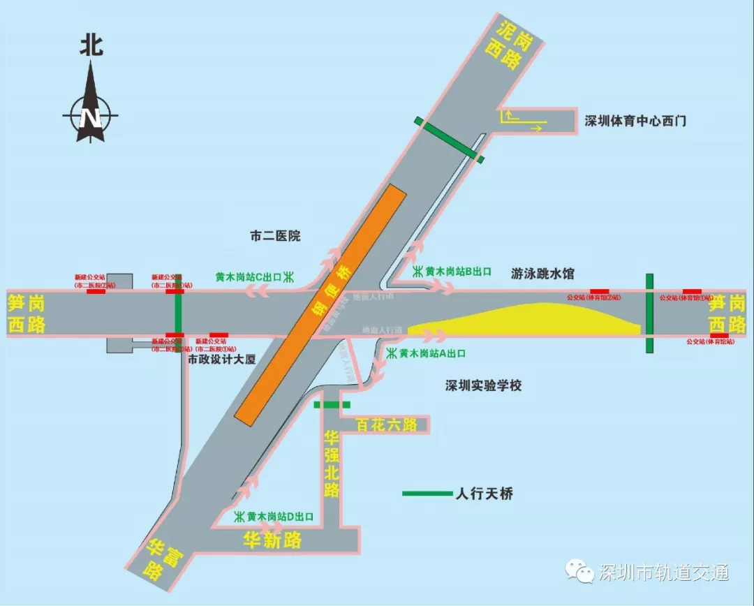 在本次調(diào)整中,華富路-泥崗西路南北向交通只能通過鋼便橋雙向六車道行車。泥崗西路、華富路、筍崗西路左轉,行人線路及“市二醫(yī)院”,“體育館”公交站臺均有所調(diào)整。