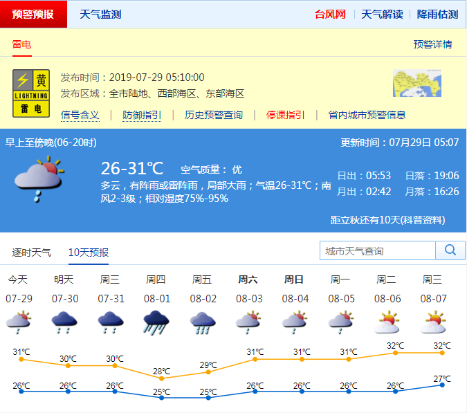 今天多云有雷陣雨,局部大雨;26-31℃;南風(fēng)2-3級(jí);濕度75%-95%。預(yù)計(jì)30-31日陰天間多云,有雷陣雨,局部暴雨;8月1日-2日有一次暴雨降雨過程;8月3日-5日降雨減弱,多云有陣雨或雷陣雨。
