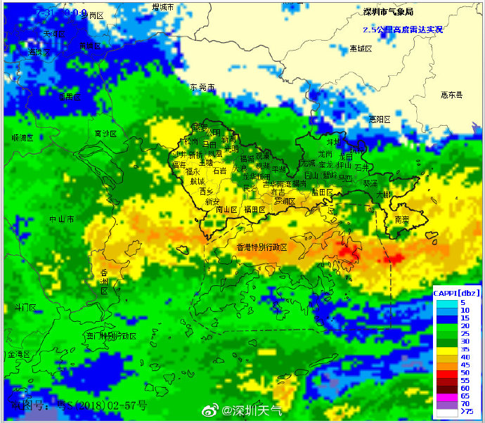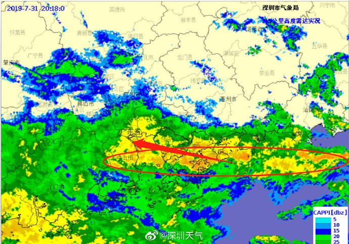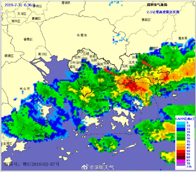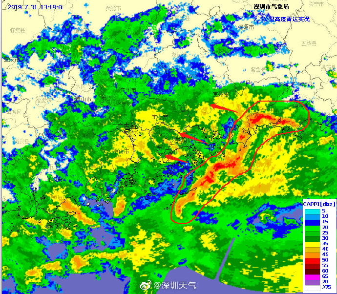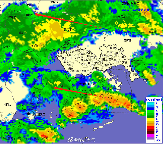 當一條雨帶的長軸和雨帶的移動方向(箭頭)夾角很小時,某個地方就會被這條雨帶幾乎從頭到尾地經(jīng)過,于是這個地方的累計雨量就會特別大。而現(xiàn)在深圳靠南的大部分區(qū)域就在經(jīng)歷一場列車效應(yīng),所以這場雨持續(xù)時間比較長,短時間內(nèi)停不下來。