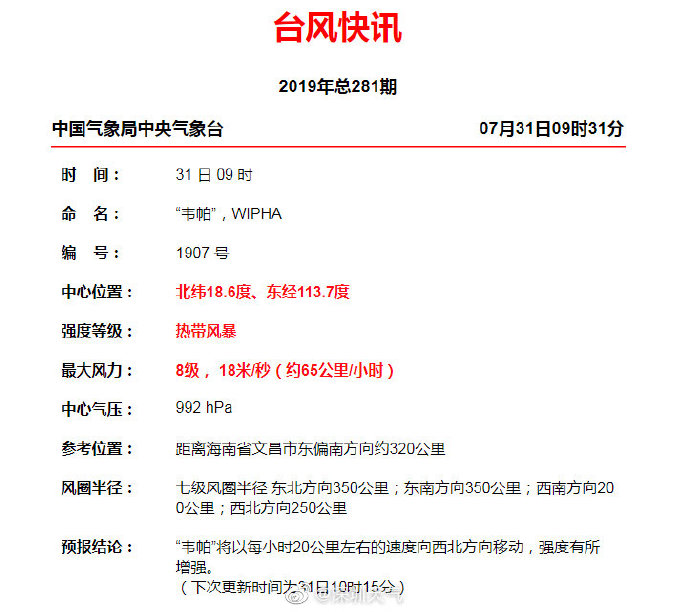 截至7月31日22時,臺風(fēng)“韋帕”(熱帶風(fēng)暴級)中心位于廣東省徐聞市東偏南方向約220公里的南海西北部海面上,中心附近最大風(fēng)力9級,達到每秒23米的風(fēng)速,六級大風(fēng)半徑范圍約480公里。