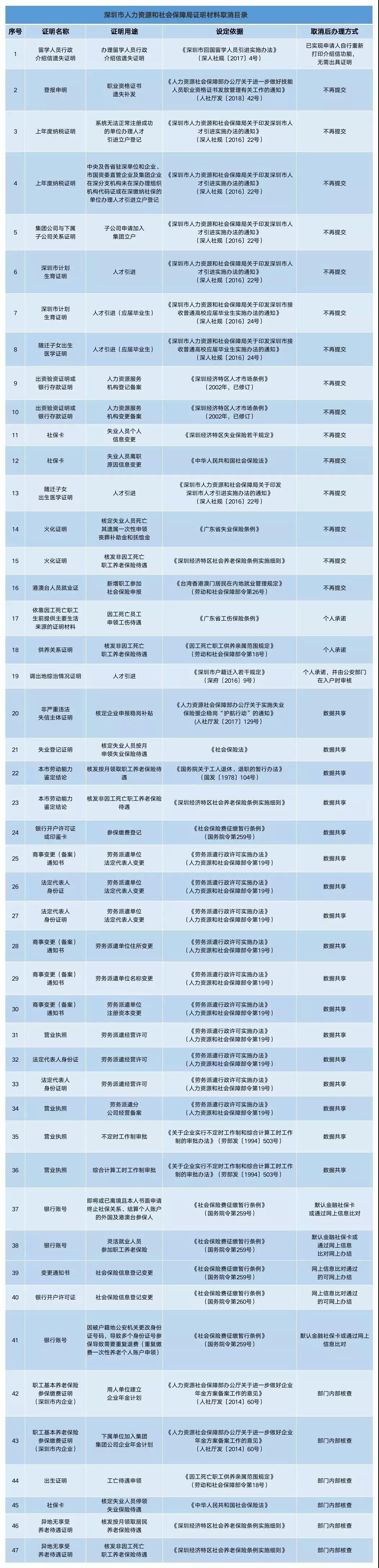 記者梳理發(fā)現(xiàn),這47項證明材料包括:新增職工參加社會保險申報,港澳臺人員就業(yè)證不用再提交;人才引進(應(yīng)屆畢業(yè)生),深圳市計劃生育證明、隨遷子女出生醫(yī)學(xué)證明無需再提交;勞務(wù)派遣單位法定代表人變更,法定代表人身份證、商事變更(備案)通知書等。