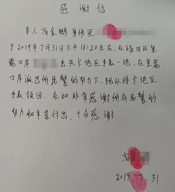 7月31日,皇崗口岸派出所接到事主高先生報(bào)警稱,其17時許在皇崗口岸某處遺失一塊手表(購置價(jià)4萬余元)。巡段民警周剛迅速出警,將事主帶回派出所詢問情況,民警周元華通過大數(shù)據(jù)分析研判,發(fā)現(xiàn)遺失手表被一男子拾到,且該男子一直在原地等待失主并未離開。隨后,周元華將男子帶回派出所歸還失物,高先生向拾金不昧的好心人表示感謝,并給民警們寫下感謝信。