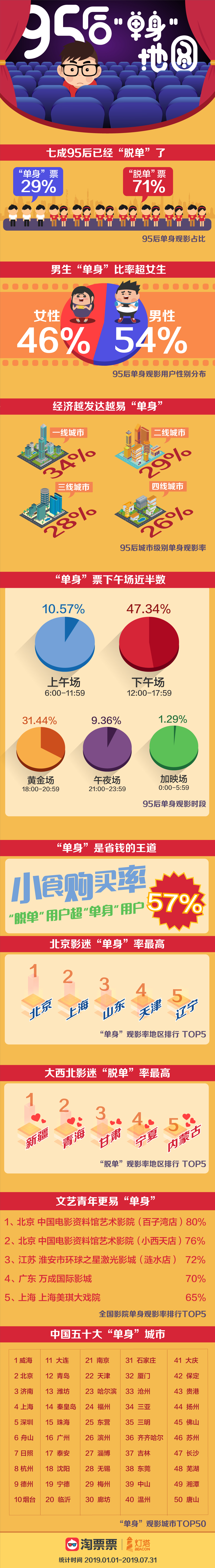 淘票票及燈塔專業(yè)版的數(shù)據(jù)顯示,在95后觀影人群中,有29%的用戶購買“單身票”(僅買一張票)觀影,而71%的95后均選擇購買兩張及以上電影票來觀影;在獨身觀影用戶中,男性以54%的占比超過女性8個百分點;情感狀態(tài)也在一定程度上決定了用戶的觀影習慣。報告數(shù)據(jù)顯示,95后“單身”用戶集中在白天觀影,僅下午場(12:00-17:59)占比就達到47.34%,而晚9點后的夜場份額占比僅1成左右。