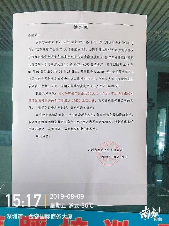 事實上,攸攸舞蹈學(xué)校清湖校區(qū)因“不定期停電影響正常上課”的情況自今年5月30日已出現(xiàn),當時即有學(xué)員猜測是校方拖欠租金所致。而8月9日,舞蹈室門外出現(xiàn)了一份落款為深圳市金籃實業(yè)有限公司的通知函,上面顯示該校區(qū)已欠繳租金、管理費、水電等費用總計56408元。足見欠費已持續(xù)一段時間。