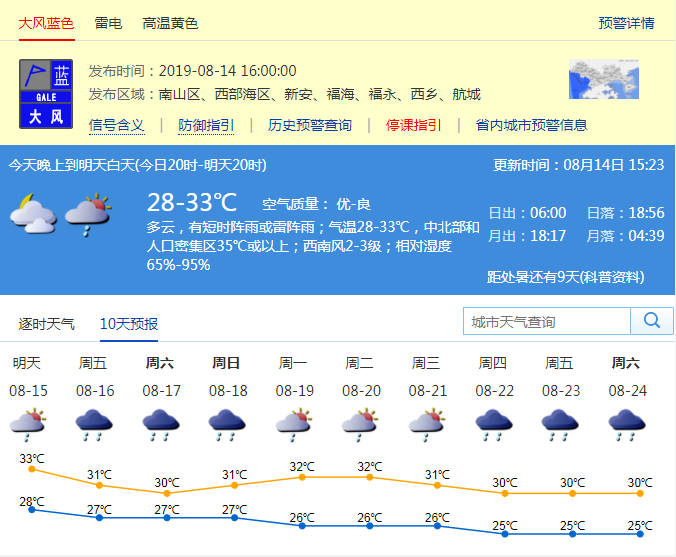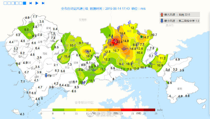 風(fēng)力逐漸減弱,深圳市氣象臺(tái)于2019年08月14日17時(shí)15分在南山區(qū),西部海區(qū)和寶安區(qū)(新安、福海、福永、西鄉(xiāng)、航城街道)取消大風(fēng)藍(lán)色預(yù)警。