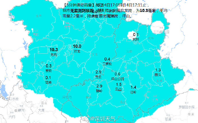 過(guò)去1小時(shí),龍崗區(qū)(坪地、寶龍、龍崗街道)和坪山區(qū)(坪山街道)累計(jì)雨量已達(dá)暴雨,預(yù)計(jì)強(qiáng)降雨還將持續(xù)1小時(shí),深圳市氣象臺(tái)于2019年08月14日17時(shí)50分在龍崗區(qū)(坪地、寶龍、龍崗街道)和坪山區(qū)(坪山街道)發(fā)布暴雨橙色分區(qū)預(yù)警,全市進(jìn)入暴雨防御狀態(tài),請(qǐng)注意防御。