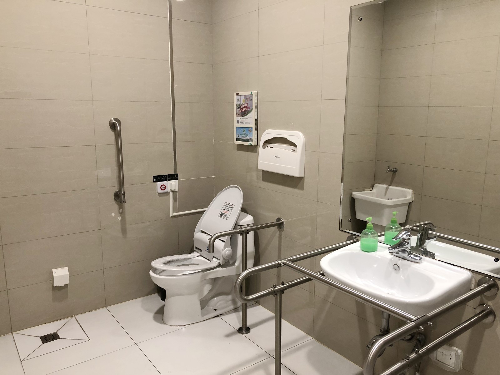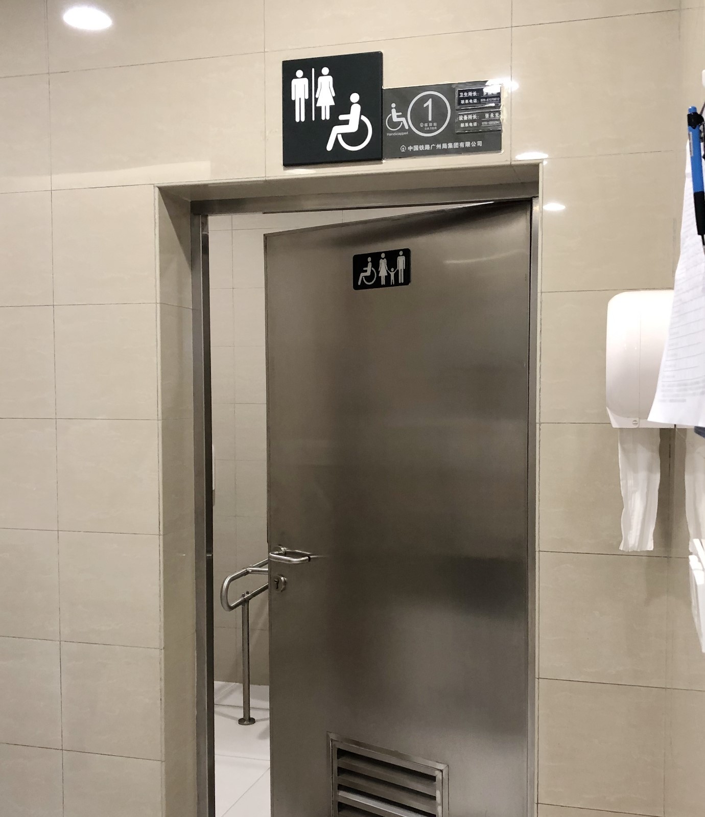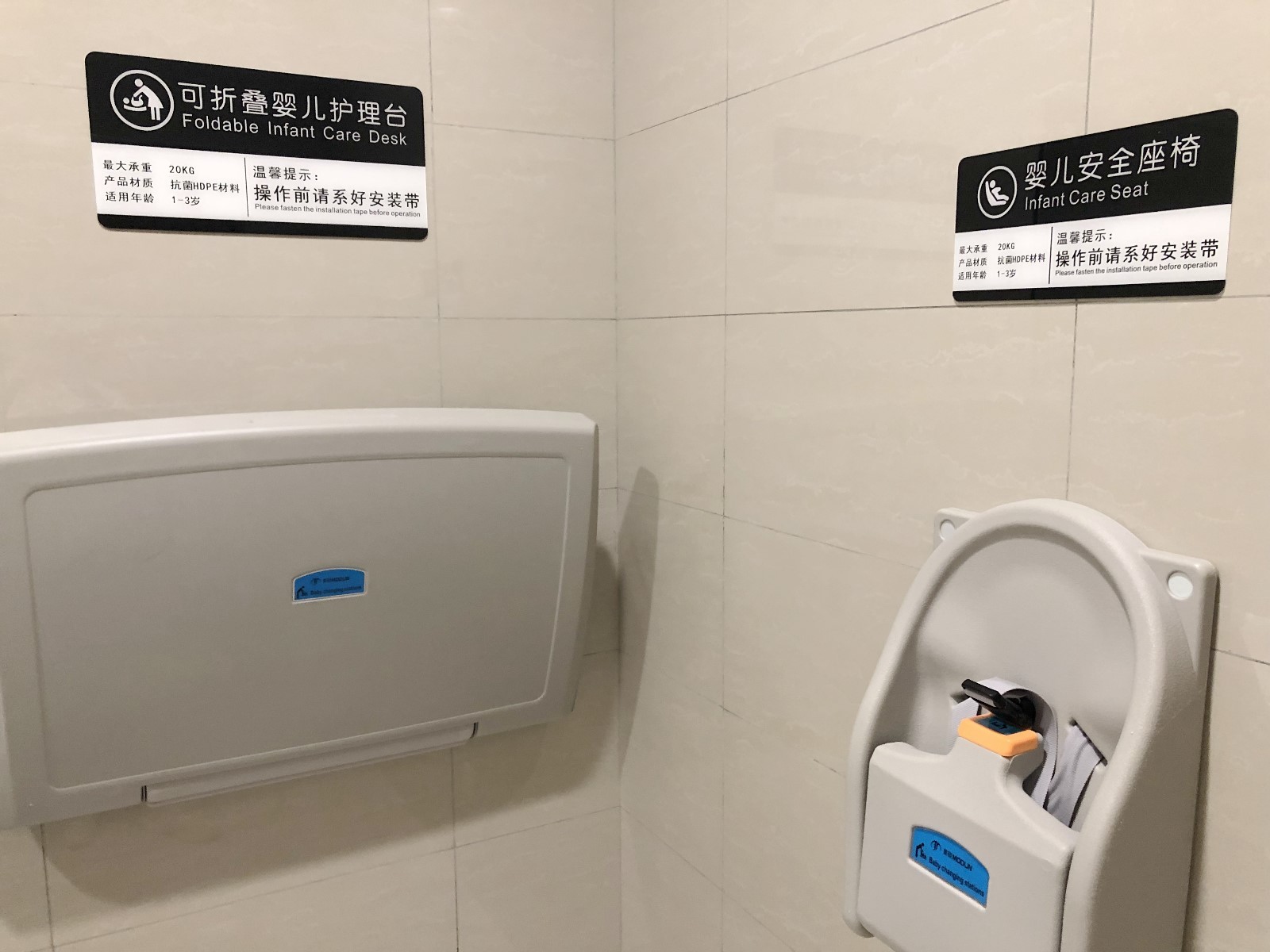 ▲在靠近福田高鐵站方向的另一處洗手間,記者在殘疾人洗手間的門上看到了第三衛(wèi)生間圖案標(biāo)識。推門進(jìn)入,里面除了設(shè)有帶扶手、供殘疾人使用的成人坐便器和洗手池之外,還有可折疊的嬰兒護(hù)理臺和嬰兒安全座椅,這顯然是一間將母嬰室、殘疾人洗手間“二合一”的洗手間,但沒有第三方洗手間配置所要求的兒童坐便器。
