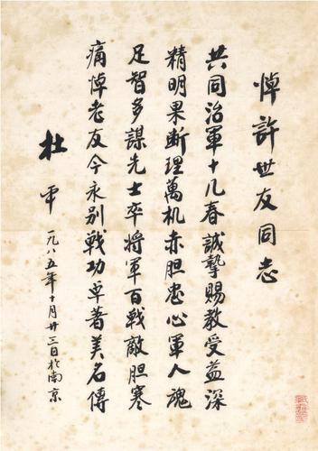 在采訪一位又一位身經(jīng)百戰(zhàn)的幸存者時,吳東峰與他們的筆墨緣也就此結(jié)下。“1985年許世友將軍因病逝世,杜平將軍親手書寫‘悼許世友同志’詩一首,請我送《人民日報(bào)》刊登,我把詩傳真過去,原件保存下來了。這首詩見證了杜平與許世友的深厚友情,是我最早的將軍墨跡手藏。那之后,我開始有意識地收集將軍們的筆墨。”