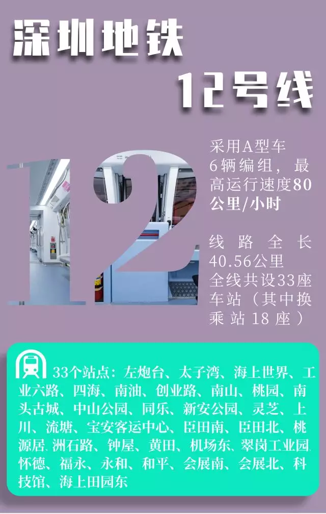 地鐵12號線起自南山區(qū)左炮臺站自南向北穿越南山中心區(qū)、寶安中心區(qū)、福永、大空港等片區(qū)后終至寶安區(qū)海上田園東站,線路全長40.56km,是進(jìn)一步支撐深圳西部發(fā)展,提升前海蛇口自貿(mào)區(qū),空港新城發(fā)展品質(zhì)的交通骨干線。