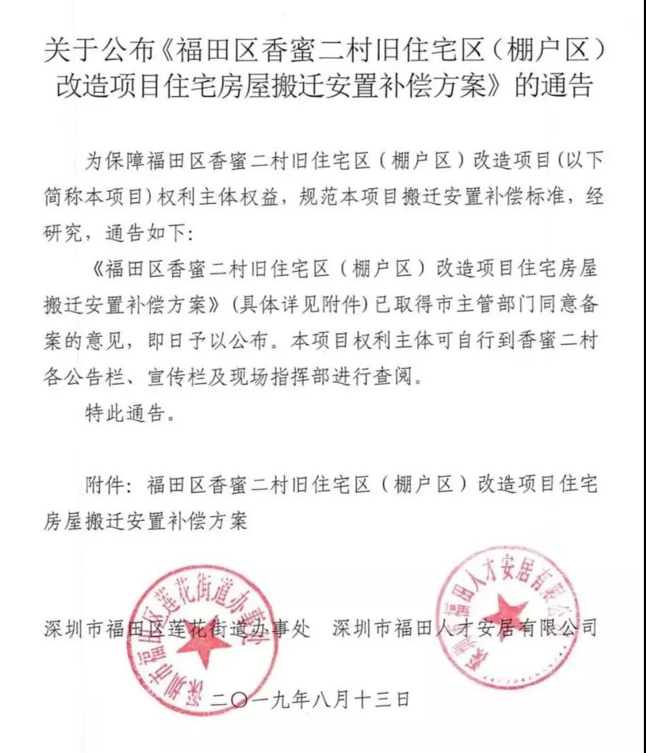 晶報(bào)2019年8月19日訊 8月13日,深圳市福田區(qū)蓮花街道辦事處和深圳市福田人才安居有限公司聯(lián)合發(fā)布"關(guān)于公布《福田區(qū)香蜜二村舊住宅區(qū)(棚改區(qū))改造項(xiàng)目住宅房屋搬遷安置補(bǔ)償方案》的通告"。