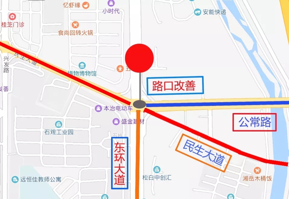 ▼改造前:東環(huán)大道、公常路皆為光明區(qū)主干道,車流量大,但車道狹窄,路口擁堵,存在極大的安全隱患。此外,該路口人車混行,非機動車逆行現(xiàn)象嚴重,中間岔口僅用石墩圍擋,安全隱患突出。