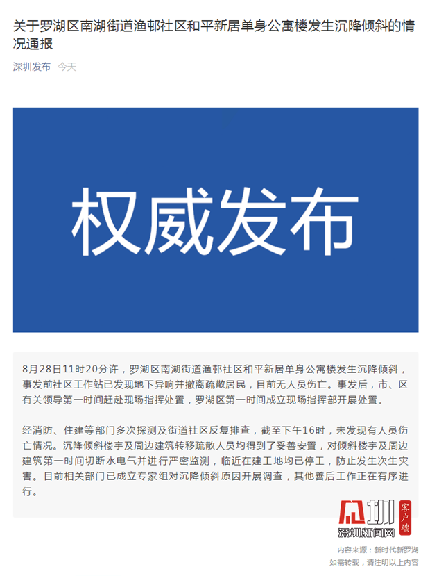 見(jiàn)圳客戶端.深圳新聞網(wǎng)2019年8月28日訊(見(jiàn)圳客戶端、深圳新聞網(wǎng)記者 張玲)8月28日11時(shí)20分許,羅湖區(qū)南湖街道漁邨社區(qū)和平新居單身公寓樓發(fā)生沉降傾斜,事發(fā)前社區(qū)工作站已發(fā)現(xiàn)地下異響并撤離疏散居民,目前無(wú)人員傷亡。目前相關(guān)部門已成立專家組對(duì)沉降傾斜原因開(kāi)展調(diào)查,其他善后工作正在有序進(jìn)行。臨時(shí)疏散人員被安置到濱河小學(xué)、羅湖小學(xué)、羅湖中學(xué)高級(jí)初中部。